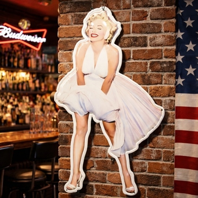 アメリカ直輸入! 映画史に残る名シーンをそのまま切り取った、マリリン・モンロー ダイカット エンボス メタルサインプレートです。 1955年公開の名作映画『七年目の浮気』で世界的に有名になった、 白いドレスが風で舞い上がるセクシーかつキュートなポーズを忠実に再現。 20世紀アメリカ映画を象徴するワンシーンとして、今なお多くのファンを魅了し続けています。 約61cmの存在感あるサイズに、ダイカット&エンボス加工を施した本格仕様。 立体感のある仕上がりで、壁に掛けるだけで一気にアメリカンな雰囲気を演出できます。 看板にはあらかじめ穴が開いているため、 ガレージ、バー、ショップ、リビングなどへの設置も簡単。 アメリカンバーやヴィンテージインテリアとの相性は抜群です。 ちなみにこの撮影シーンは、当時夫だったMLBスター「ジョー・ディマジオ」との大喧嘩の原因にもなり、 後に離婚へと繋がったという有名なエピソードも残っています。 それほどまでに衝撃的で、歴史に刻まれた名シーンというわけですね。 【サイズ】 W350 × D6 × H615mm 【材質】 ブリキ(メタル)製 【おすすめ使用シーン】 ・アメリカンバー / BAR 店舗装飾 ・ガレージインテリア / 男前インテリア ・ショップディスプレイ / 壁掛け看板 【注意事項】 ※製品の性質上、角の曲がり・小さな折れ・キズ・汚れが見られる場合がございます。 ※材質上、軽微な曲がりは手で調整可能です。 ※著しく状態の悪い商品は発送いたしません。 ※ヴィンテージテイスト・輸入雑貨の「味」としてご理解の上、ご注文をお願いいたします。 【検索キーワード】 マリリンモンロー / Marilyn Monroe / ブリキ看板 / メタルサイン / ダイカット看板 / エンボス看板 / アメリカン雑貨 / アメリカンバー インテリア / ガレージ看板 / 輸入雑貨 / 店舗装飾