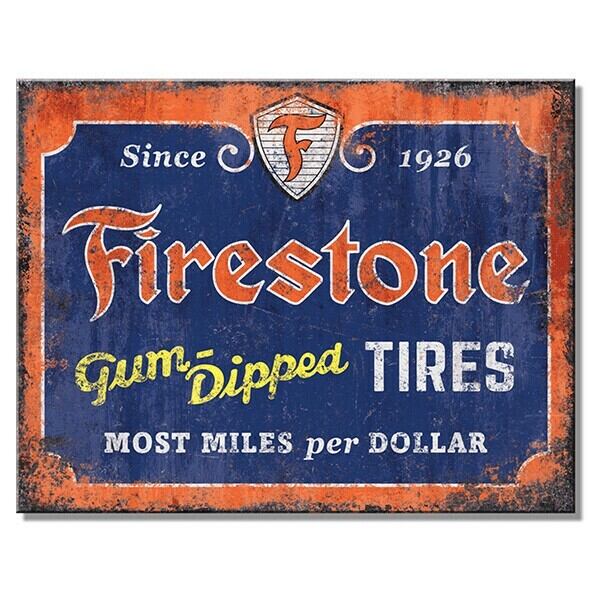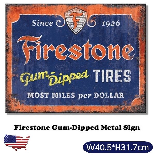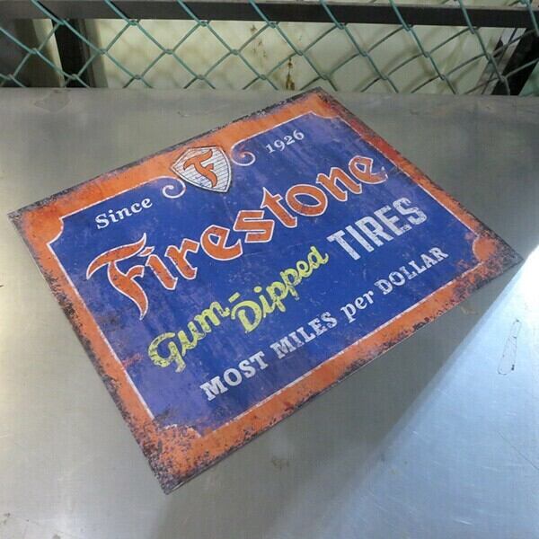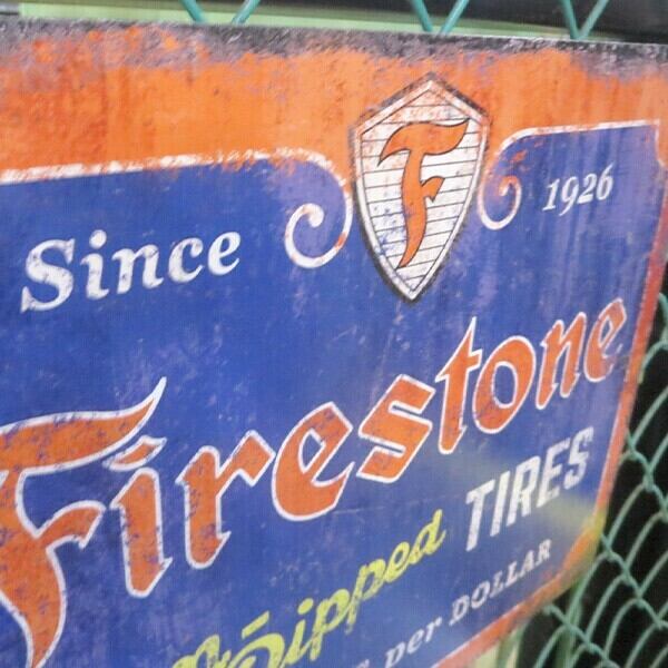看板に書かれている「ガムディップタイヤ」とは、主に20世紀初頭にファイアストン社が開発した製造工程のこと。