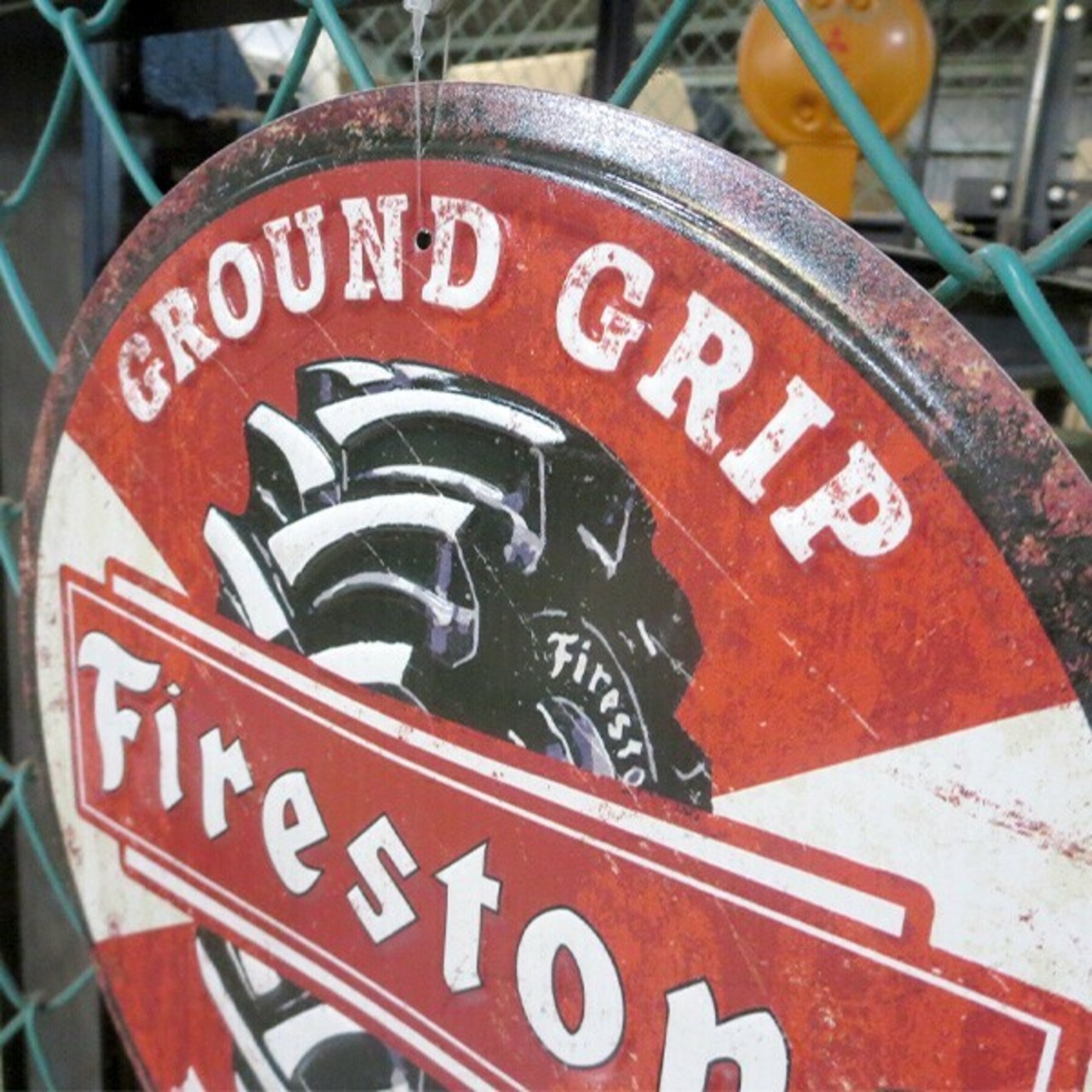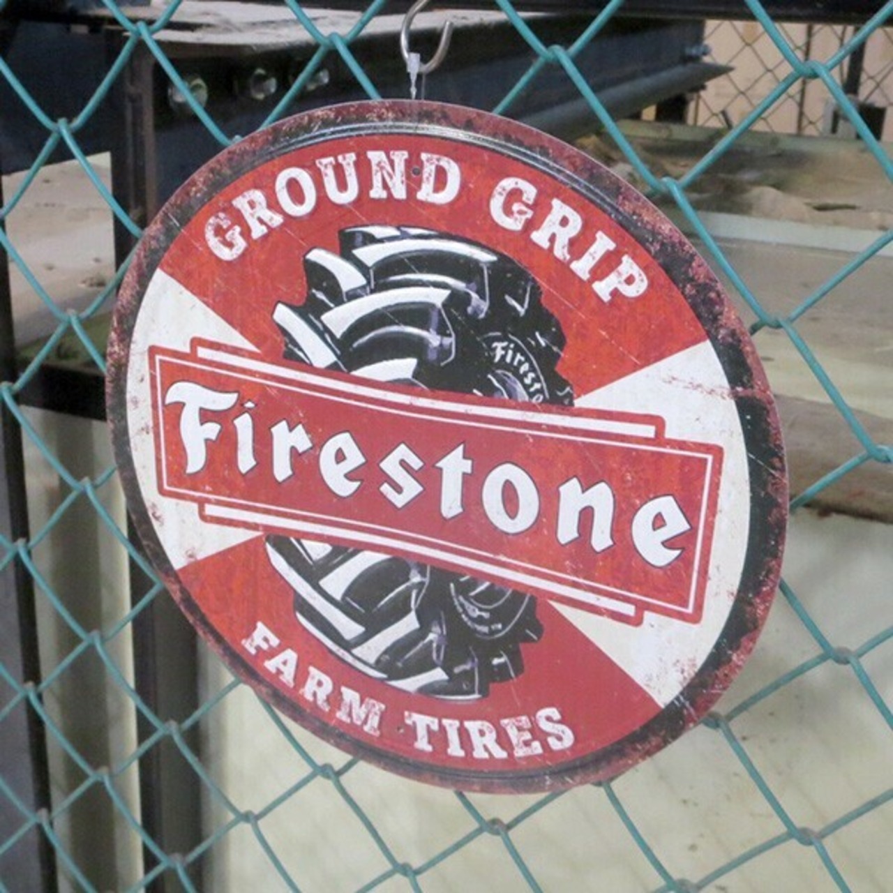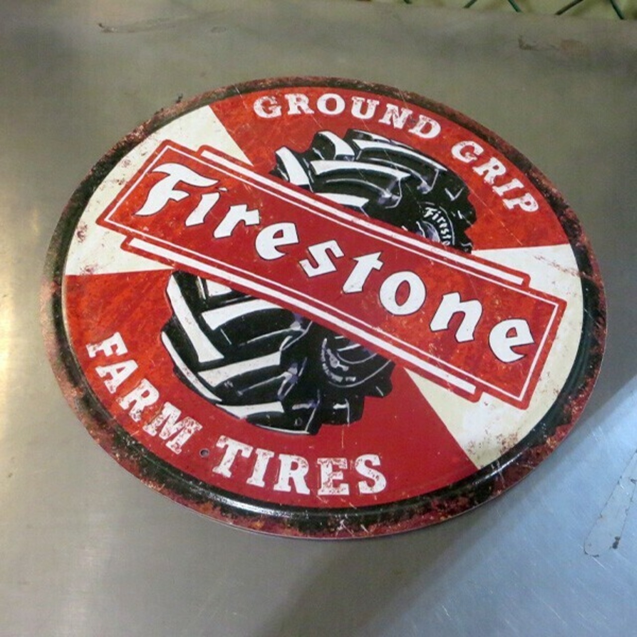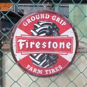 ファイアストン ブリキ看板 ダメージ仕様 アメリカン ガレージ ラウンド エンボス メタルサイン FIRESTONE FARM TIRES 丸型 アンティーク調 アメリカン メタルサイン アメリカン雑貨 インテリア 壁掛け サインプレート アメリカ雑貨 アメ車 レトロ おしゃれ 壁装飾品 看板