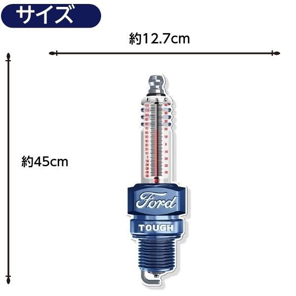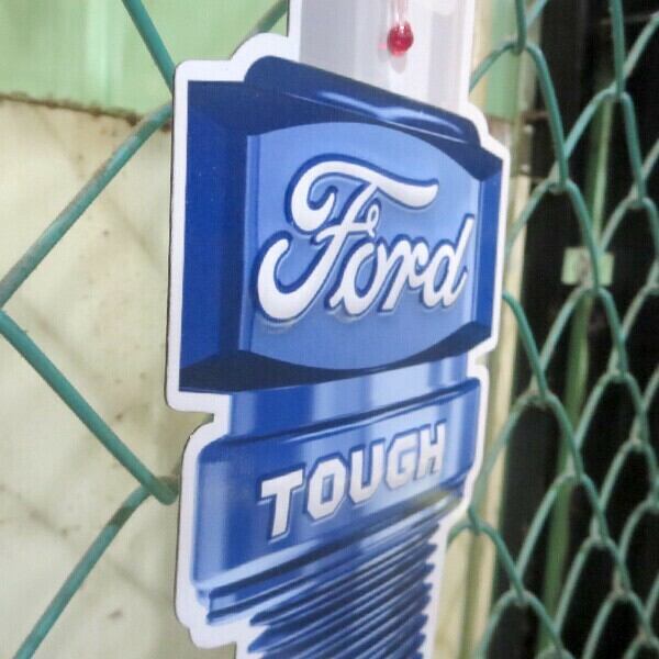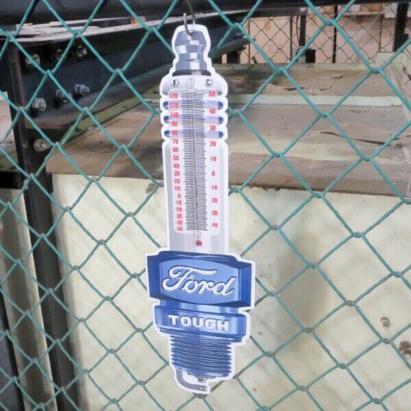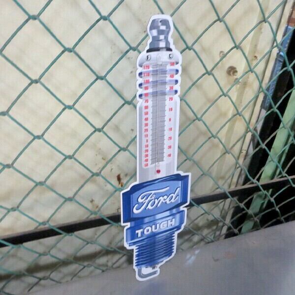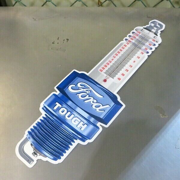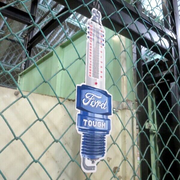 ダイカット&エンボス加工のFord プラグ メタルサイン 温度計付き看板です。