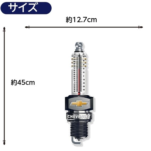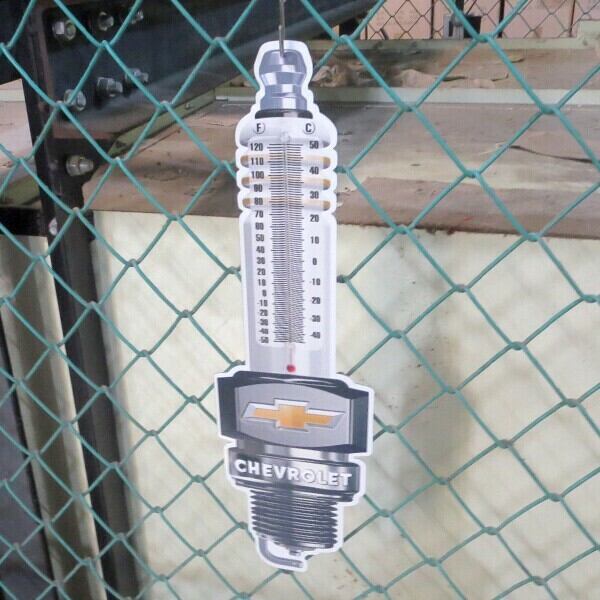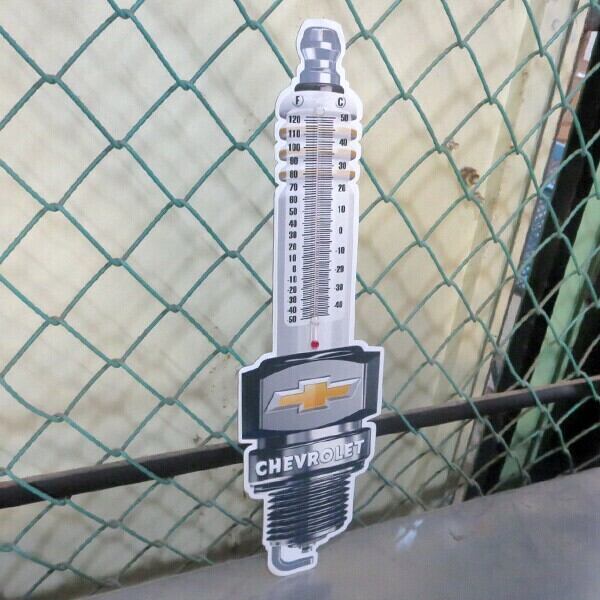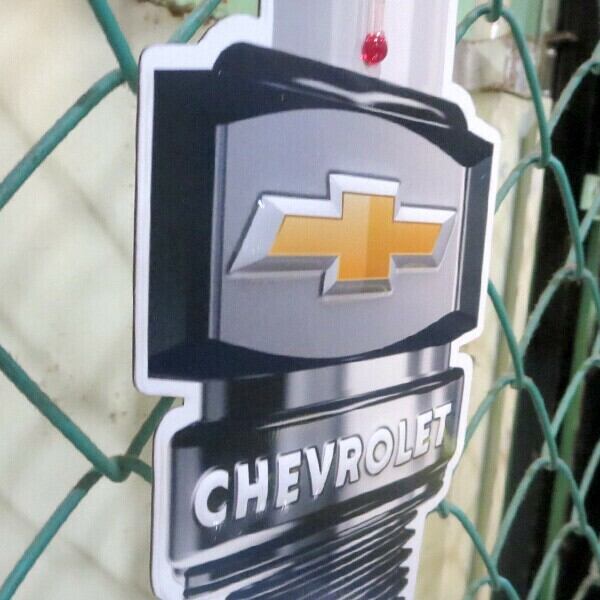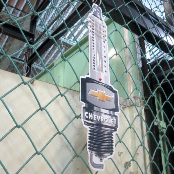 ダイカット&エンボス加工のCHEVROLET プラグ メタルサイン 温度計付き看板です。