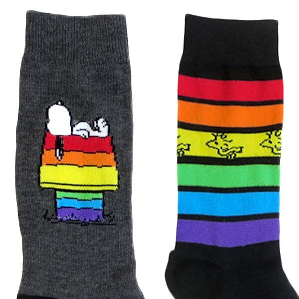 グレーベースにレインボーの犬小屋でスヌーピーが寝ている姿が描かれているソックスの2タイプ。